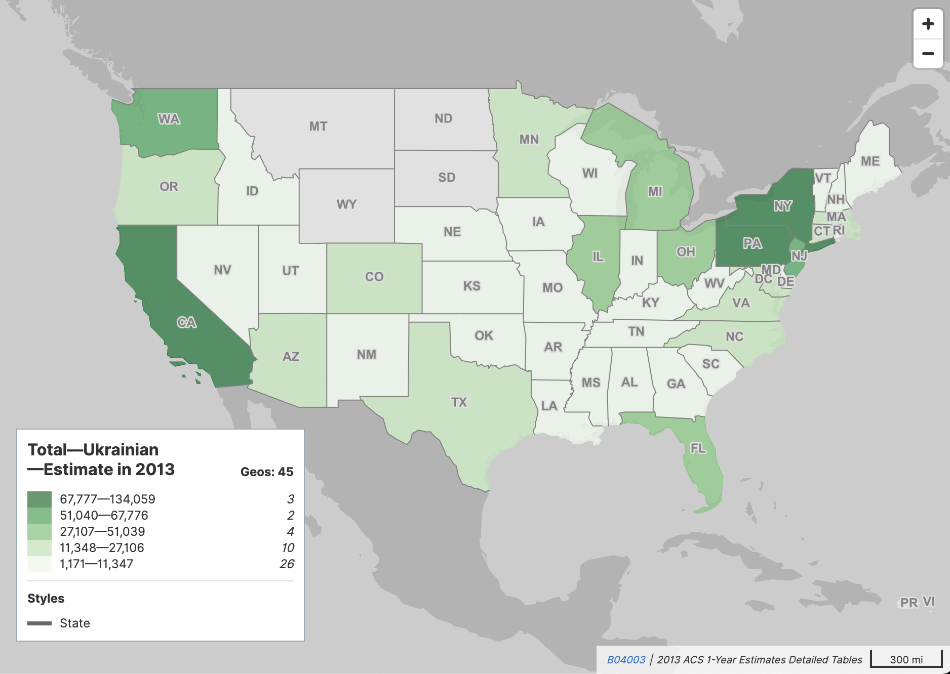 This map shows the states with the largest number of people that identify as having Ukrainian ancestry. Click on the map to view it on the US Census Website.